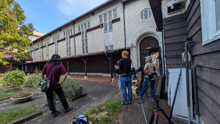 ハイド記念館と教育会館前にある中庭では、祠堂学院高等学校の掲示板のある中庭として撮影が行われました。