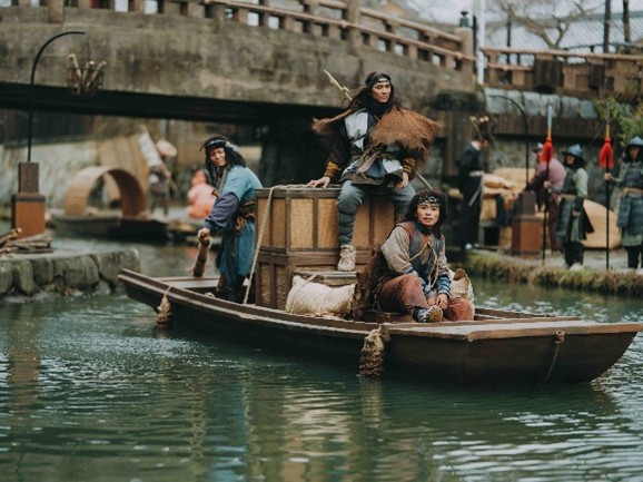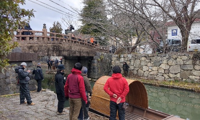 時代劇ロケの定番ロケ地である八幡堀では、阮小五(加藤清史郎)らが塩を密輸するために運河の関所をやり過ごすシーンなどが撮影されました。この撮影のために中国から八幡堀まで持ってきたという木船にも注目です。